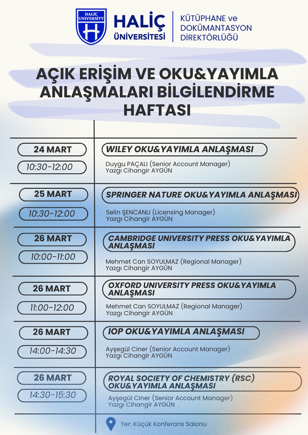 Kütüphane ve Dokümantasyon Direktörlüğü tarafından 24-26 Mart 2026 tarihleri arasında “Açık Erişim ve Oku & Yayımla Anlaşmaları Bilgilendirme Seminerleri” verilecektir. Üniversitemizin ve ülkemizin bilimsel yayın görünürlüğüne ve üretkenliğine büyük katkı sağlayan bu anlaşmaların; araştırma ekosistemimizin güçlendirilmesine katkısı ve açık erişim yayın süreçlerine dair tüm detaylar paylaşılacaktır.